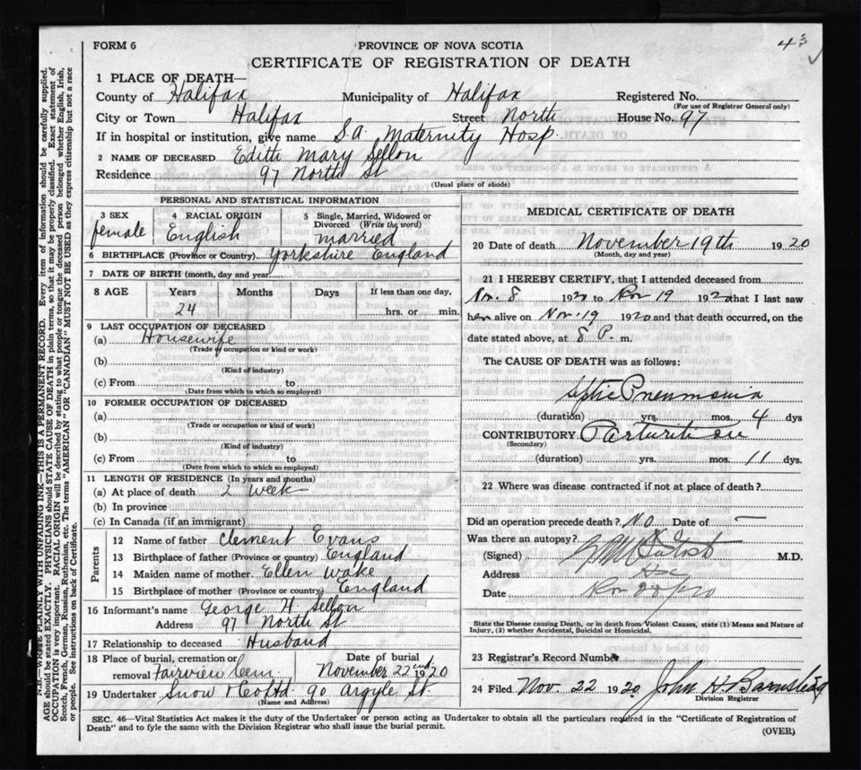 Death Registration: Year: 1920 file: 72 number: 43