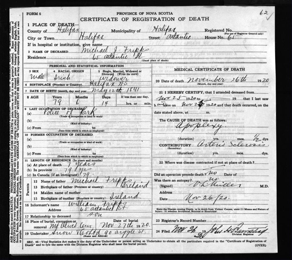 Death Registration: Year: 1920 file: 72 number: 62