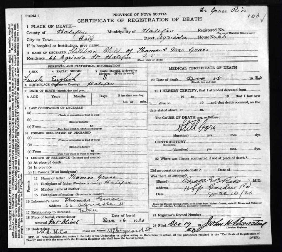 Death Registration: Year: 1920 file: 72 number: 103