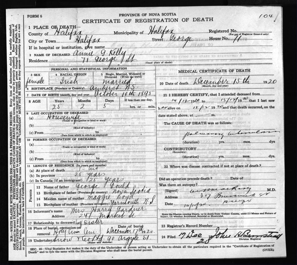 Death Registration: Year: 1920 file: 72 number: 104