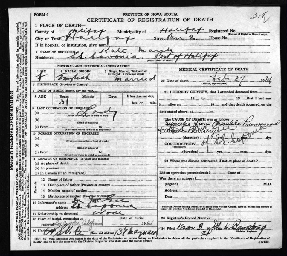 Death Registration: Year: 1921 file: 72 number: 318