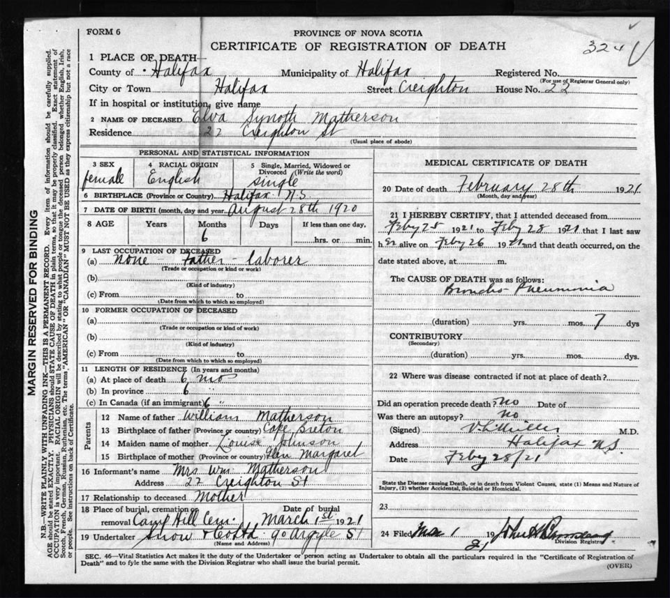 Death Registration: Year: 1921 file: 72 number: 324