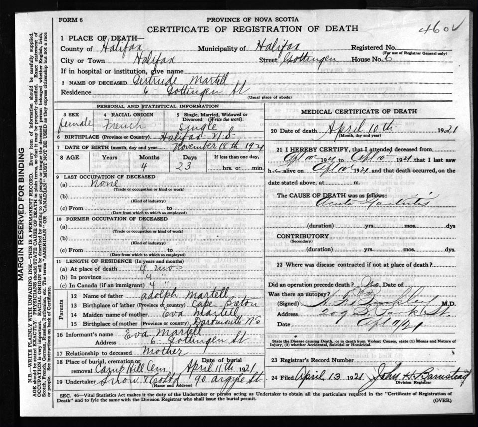 Death Registration: Year: 1921 file: 72 number: 460