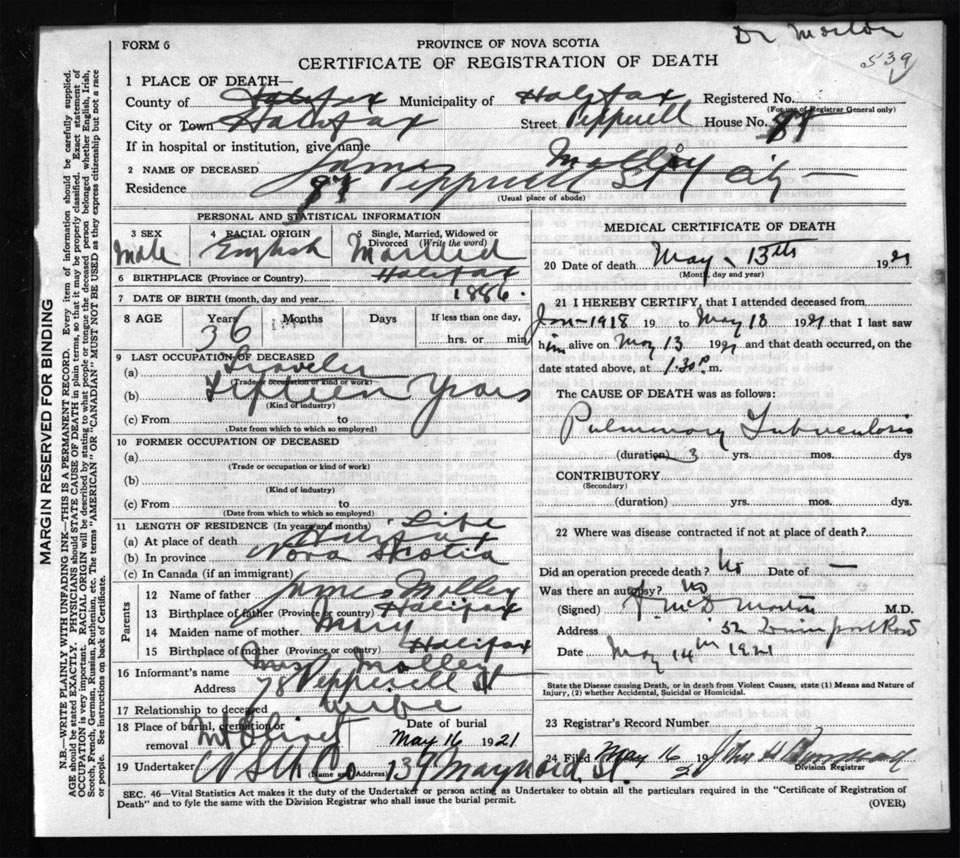 Death Registration: Year: 1921 file: 72 number: 539