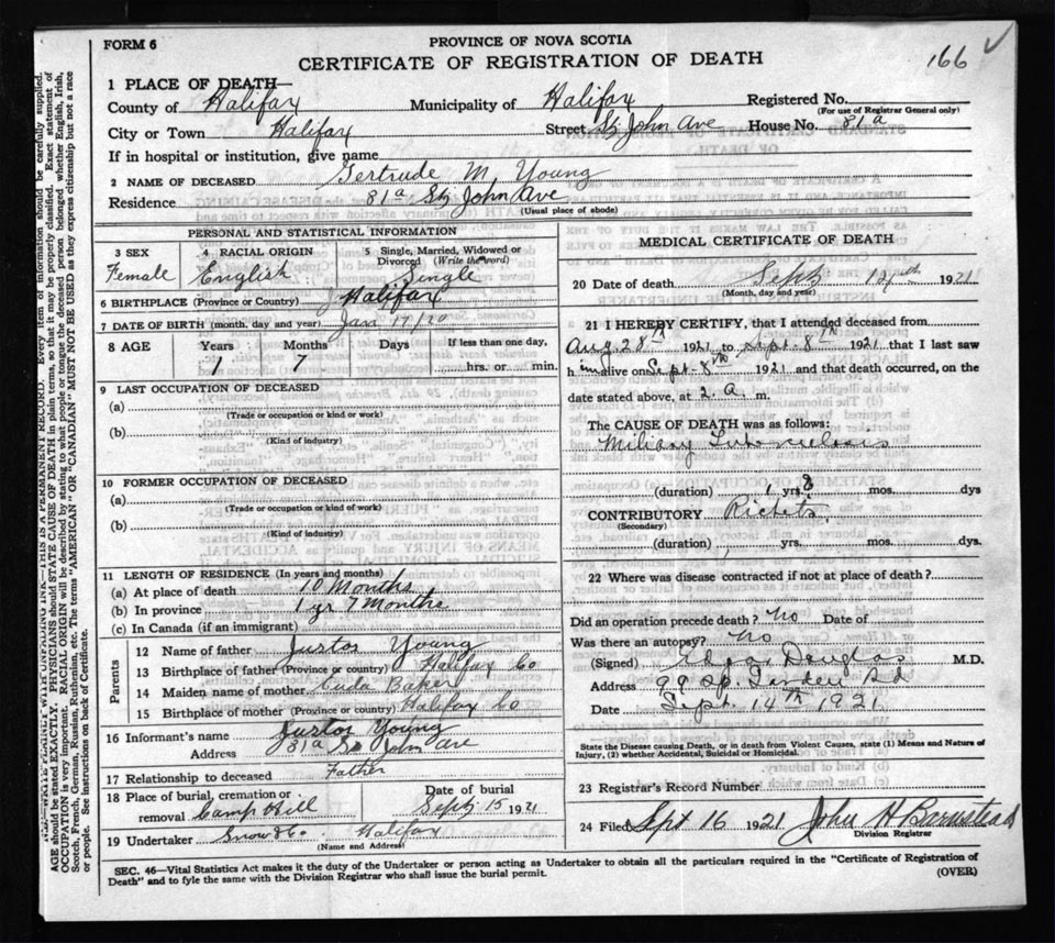 Death Registration: Year: 1921 file: 73 number: 166