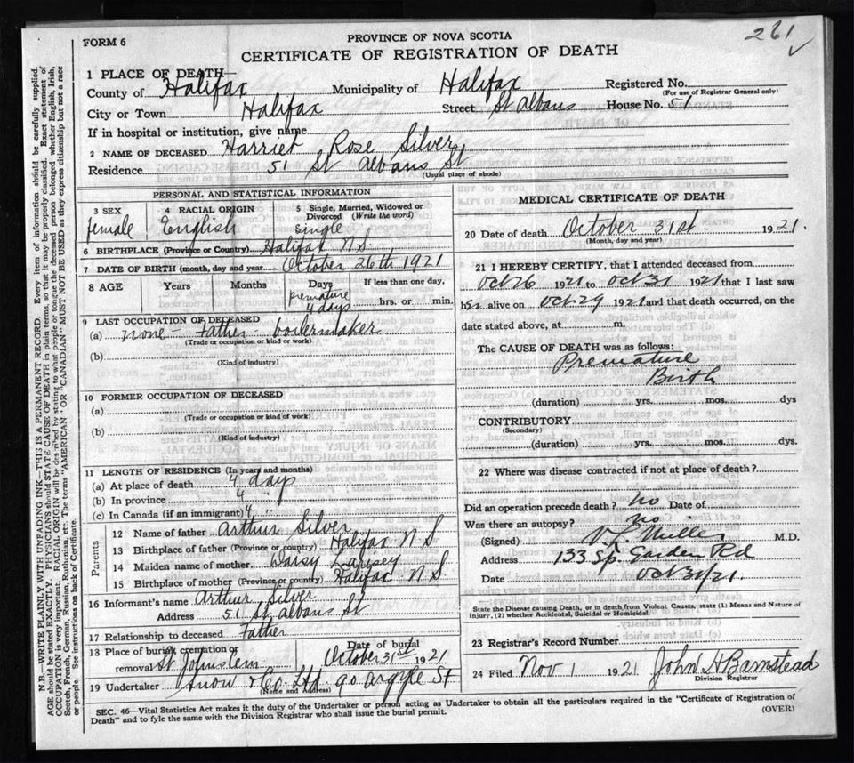 Death Registration: Year: 1921 file: 73 number: 261