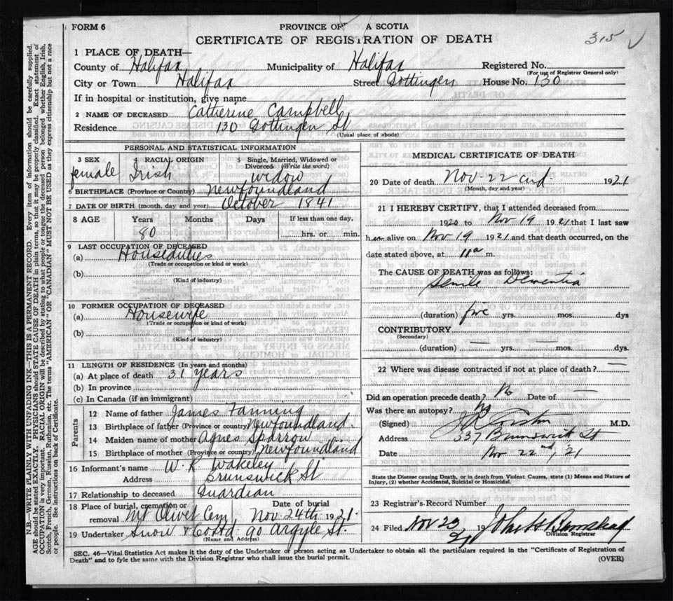 Death Registration: Year: 1921 file: 73 number: 315