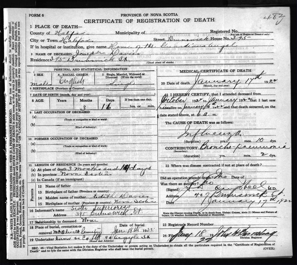Death Registration: Year: 1922 file: 73 number: 482