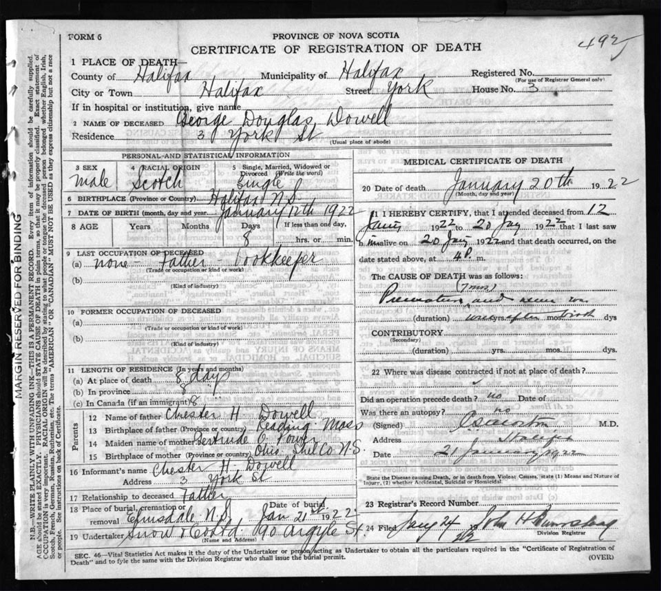 Death Registration: Year: 1922 file: 73 number: 492