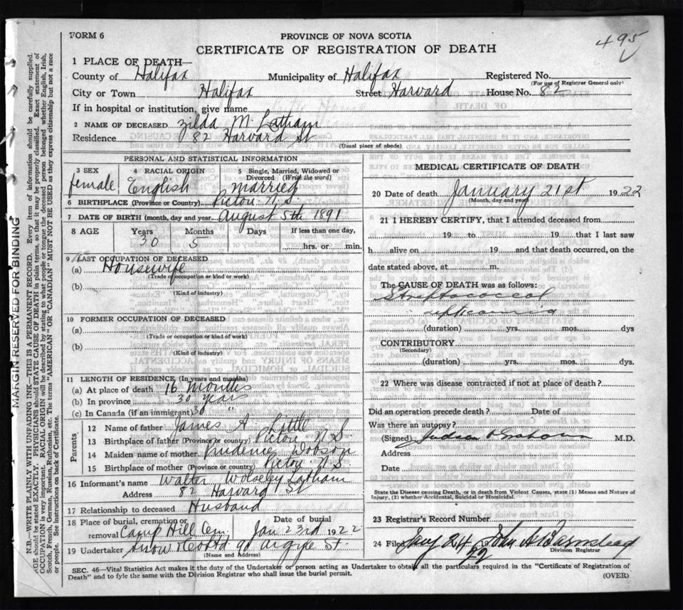 Death Registration: Year: 1922 file: 73 number: 495