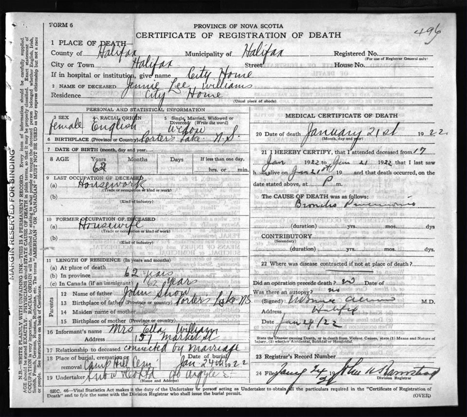 Death Registration: Year: 1922 file: 73 number: 496