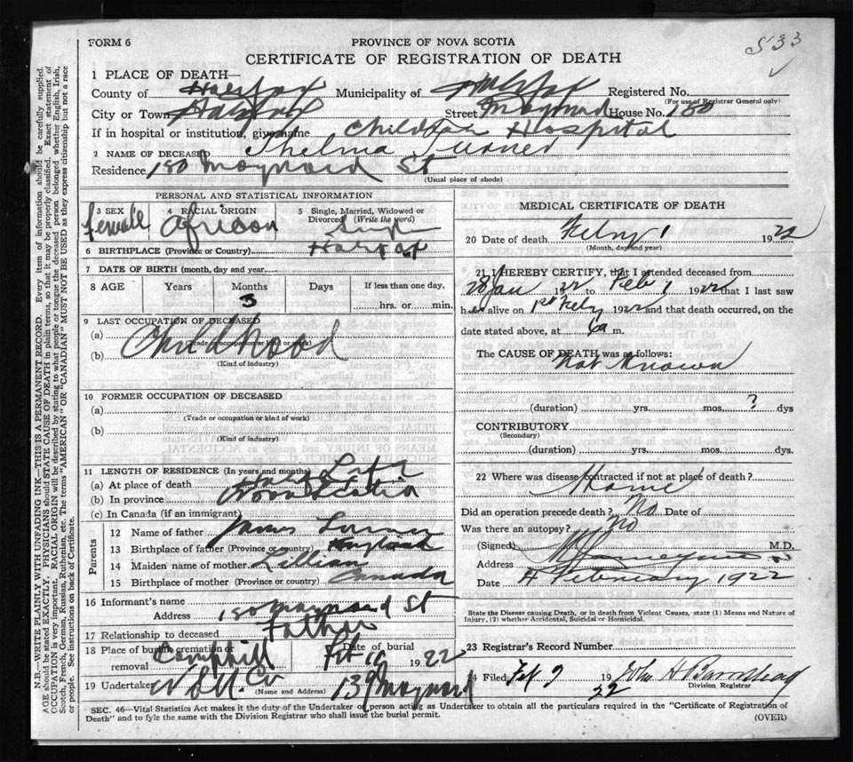 Death Registration: Year: 1922 file: 73 number: 533
