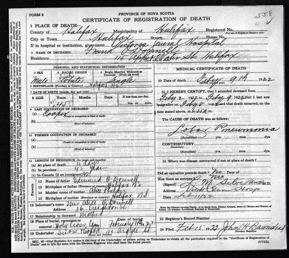 Death Registration: Year: 1922 file: 73 number: 558