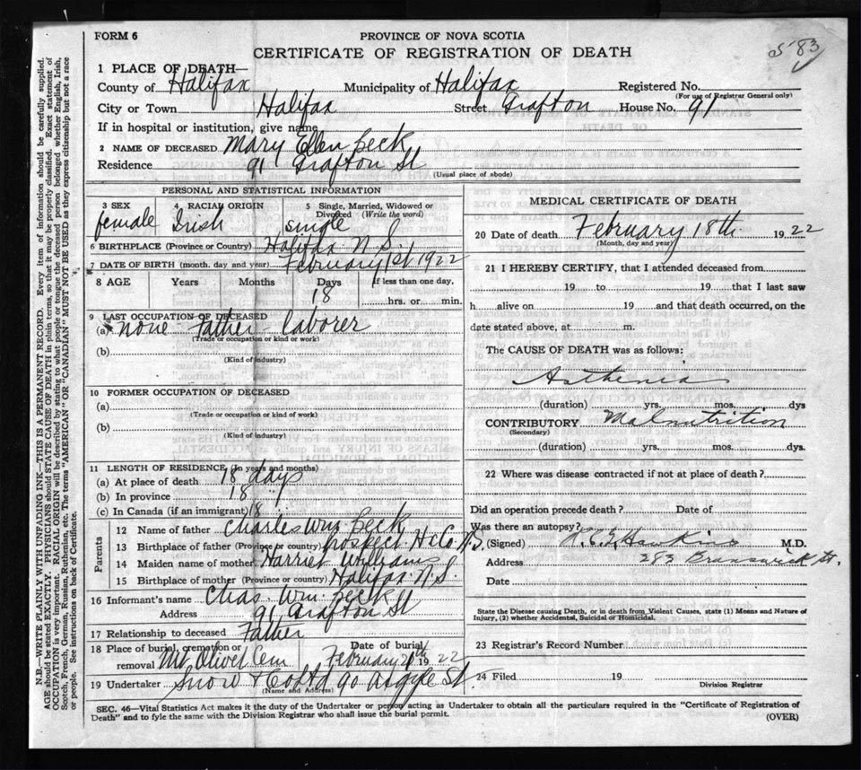 Death Registration: Year: 1922 file: 73 number: 583