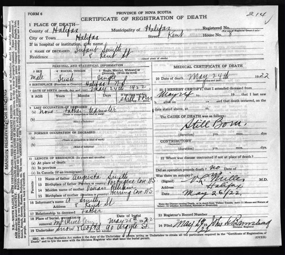 Male Death Registration: Year: 1922 file: 74 number: 214