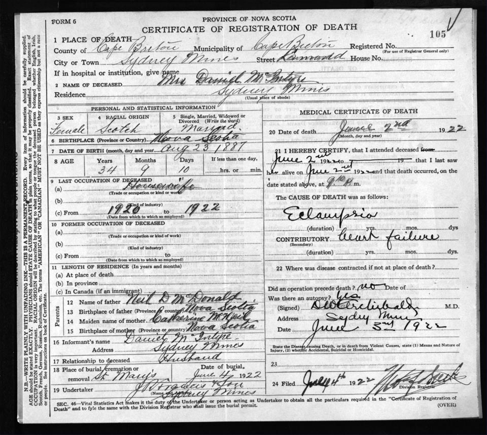 Death Registration: Year: 1922 file: 76 number: 105