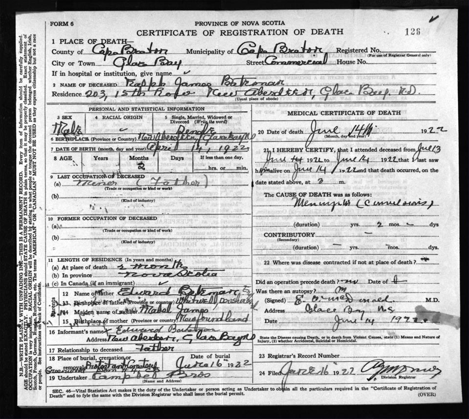 Death Registration: Year: 1922 file: 76 number: 126
