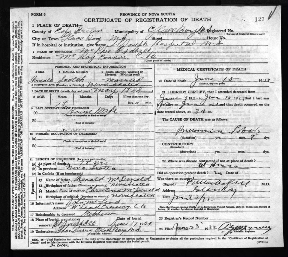 Death Registration: Year: 1922 file: 76 number: 127