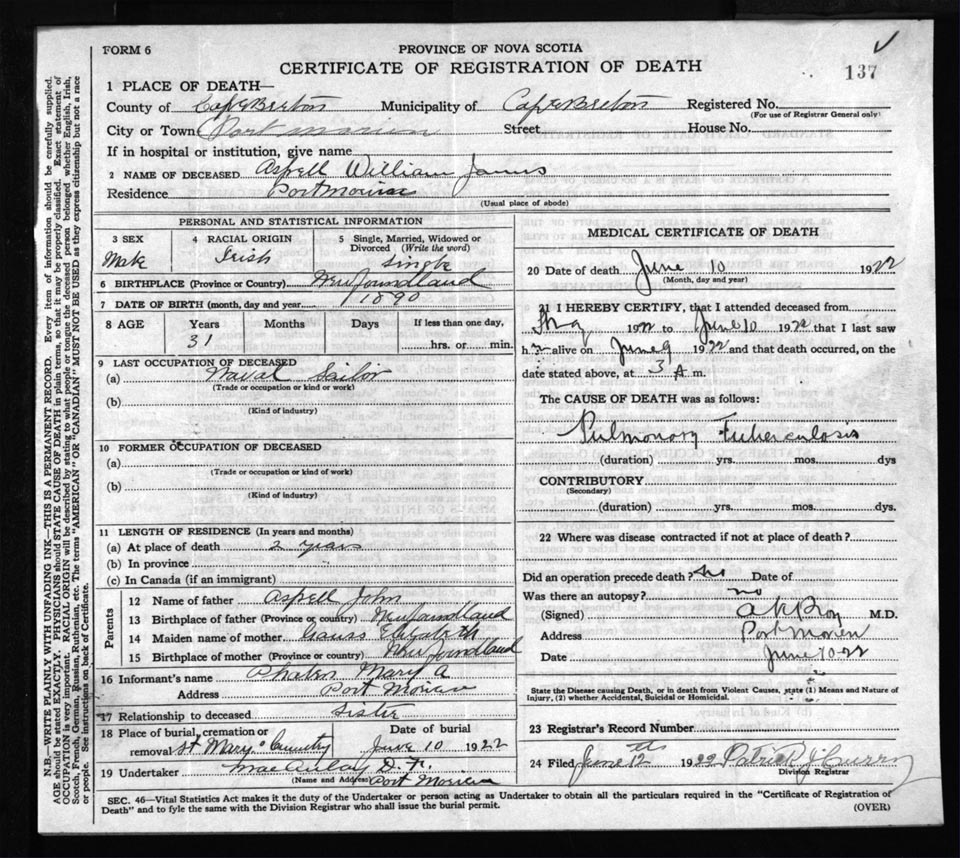 Death Registration: Year: 1922 file: 76 number: 137