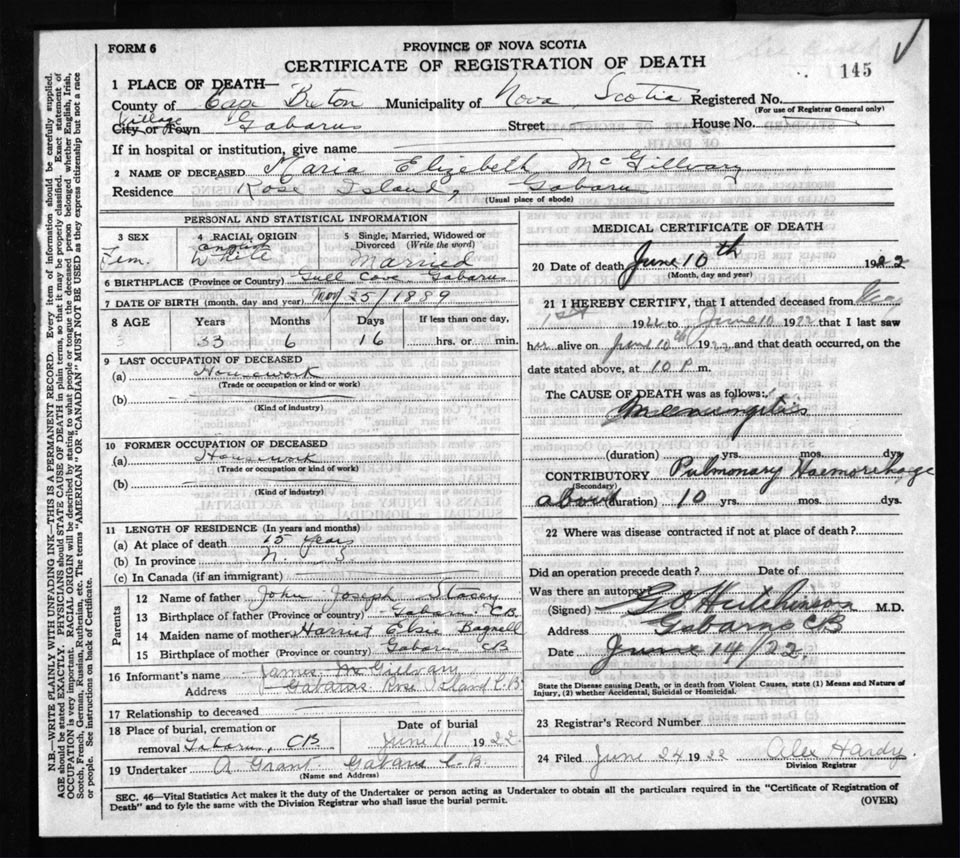 Death Registration: Year: 1922 file: 76 number: 145