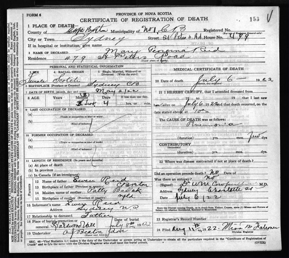 Death Registration: Year: 1922 file: 76 number: 153