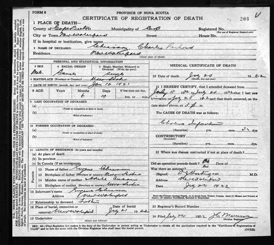 Death Registration: Year: 1922 file: 76 number: 206