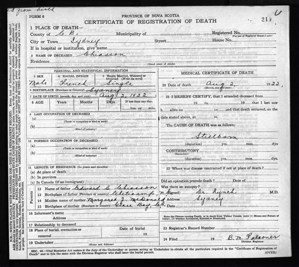 Male Death Registration: Year: 1922 file: 76 number: 219