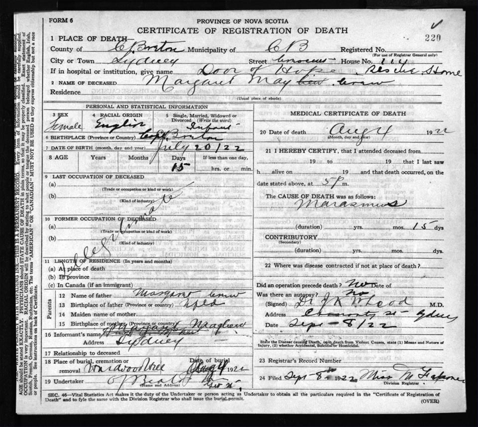 Death Registration: Year: 1922 file: 76 number: 220