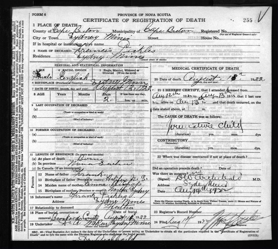 Death Registration: Year: 1922 file: 76 number: 255