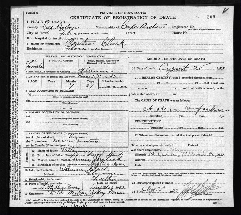 Death Registration: Year: 1922 file: 76 number: 260