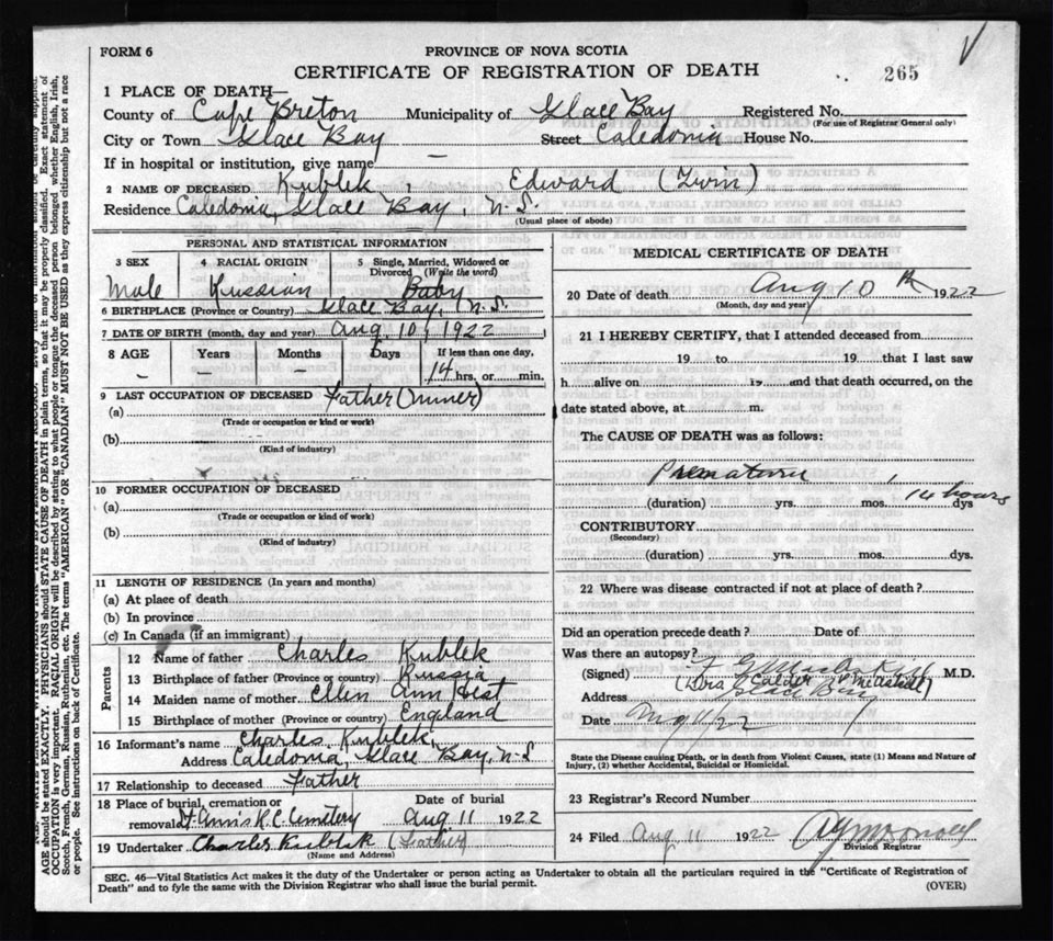 Death Registration: Year: 1922 file: 76 number: 265