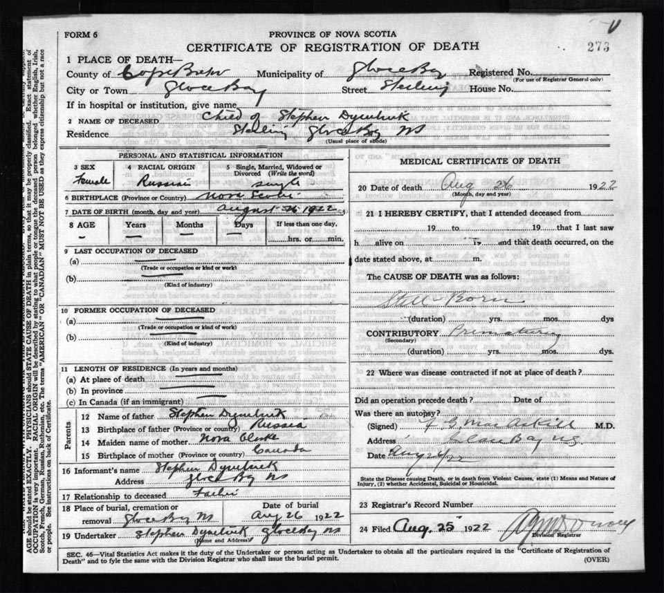 Death Registration: Year: 1922 file: 76 number: 273