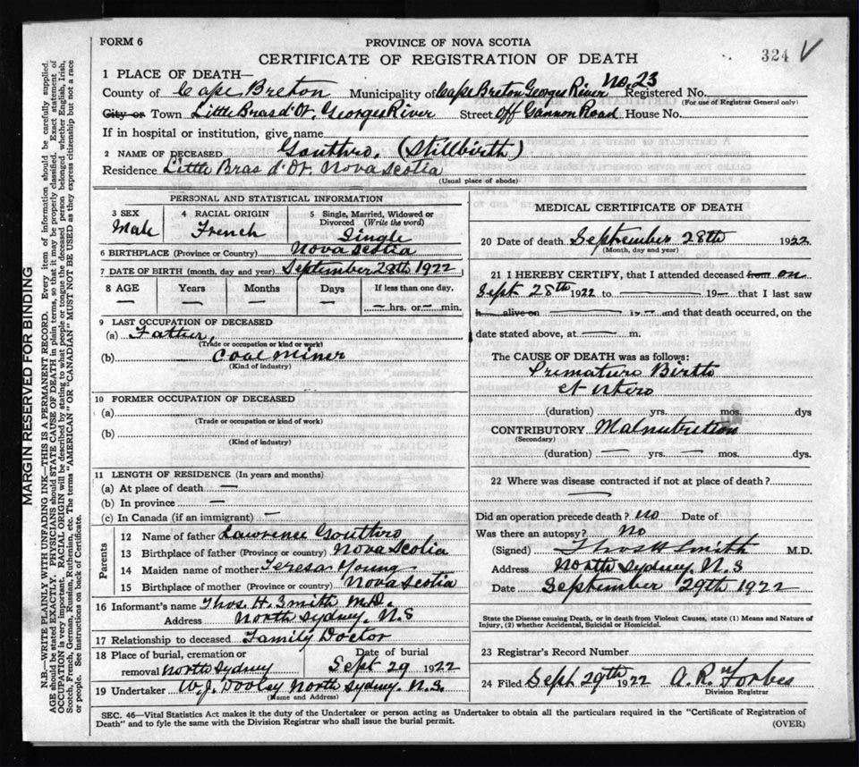 Male Death Registration: Year: 1922 file: 76 number: 324
