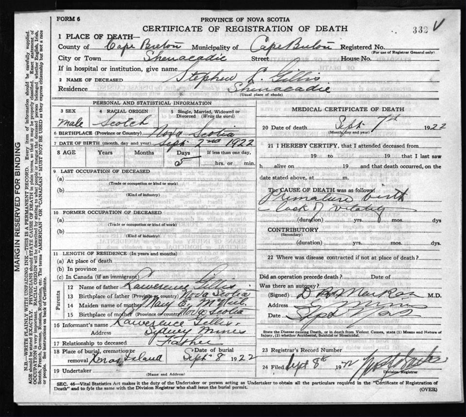 Death Registration: Year: 1922 file: 76 number: 332