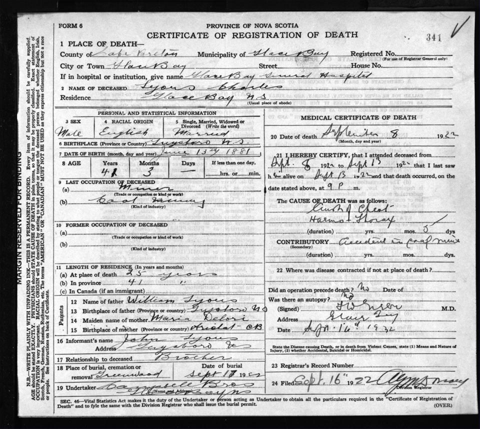 Death Registration: Year: 1922 file: 76 number: 341