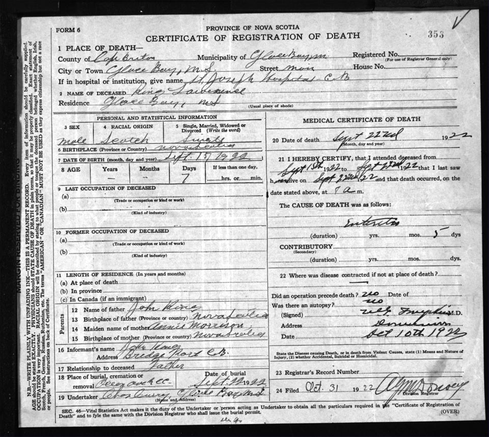 Death Registration: Year: 1922 file: 76 number: 353
