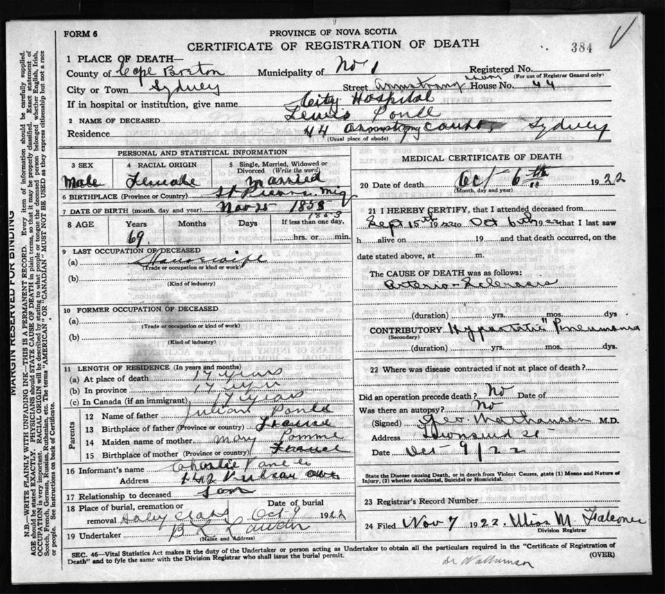 Death Registration: Year: 1922 file: 76 number: 384