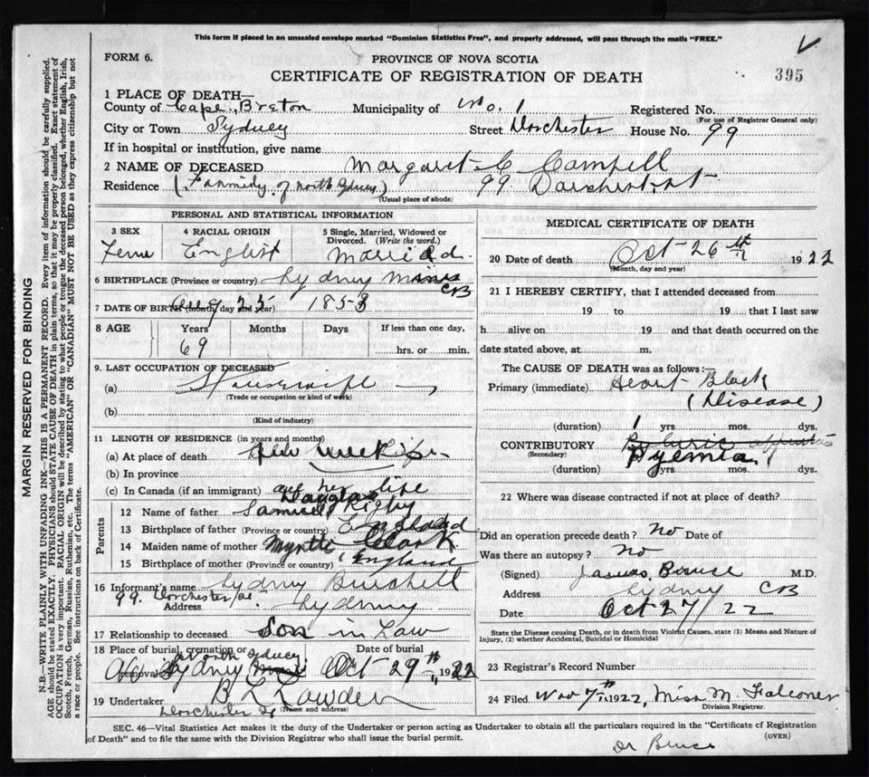 Death Registration: Year: 1922 file: 76 number: 395