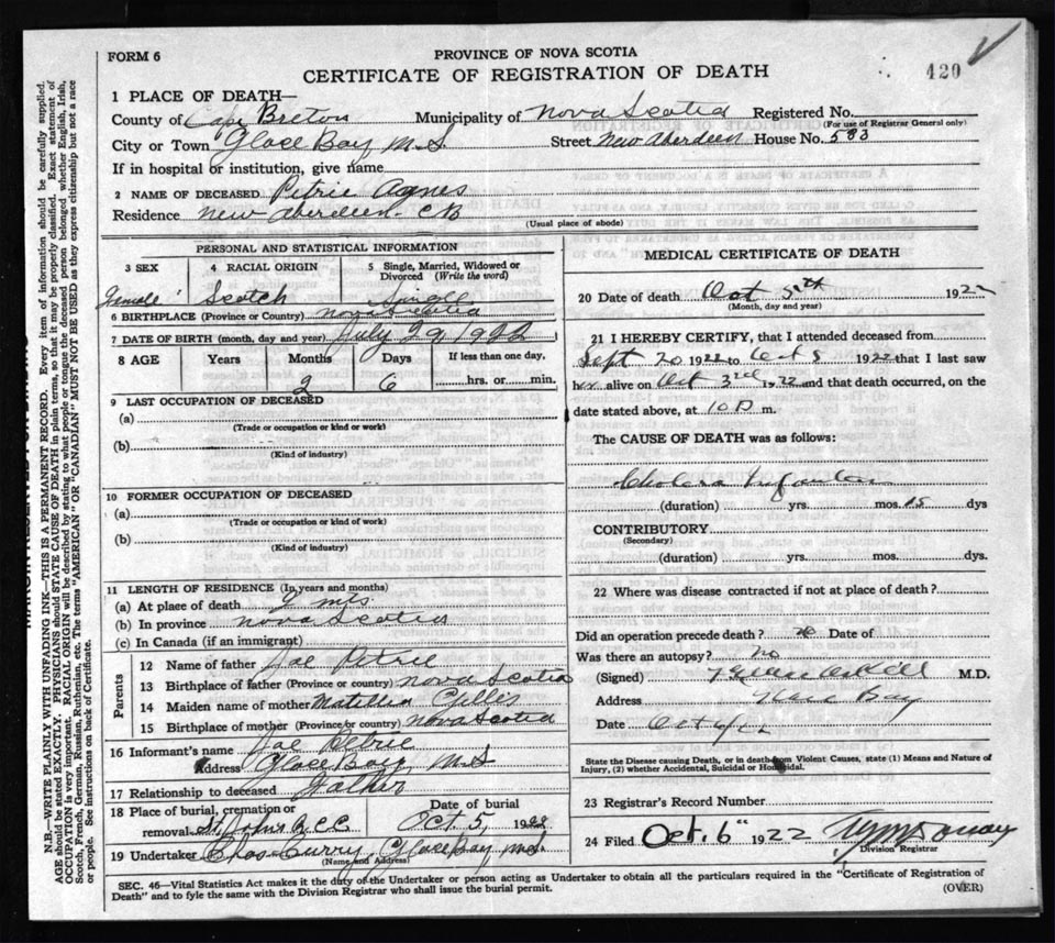 Death Registration: Year: 1922 file: 76 number: 420