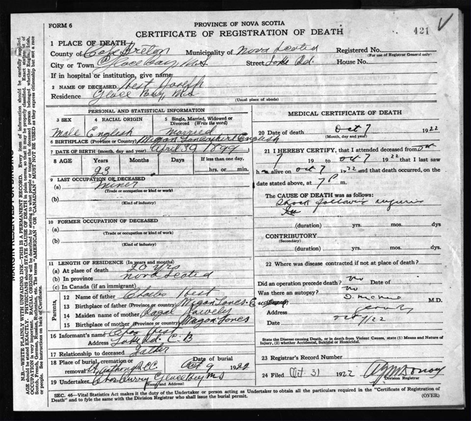 Death Registration: Year: 1922 file: 76 number: 421