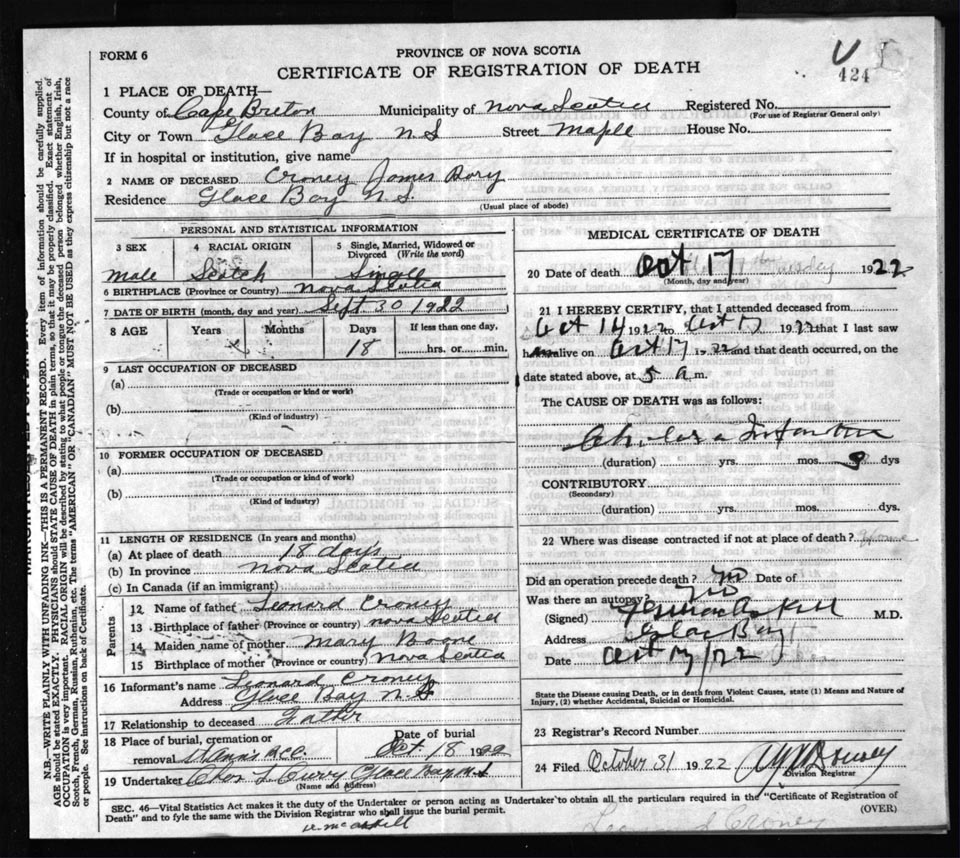 Death Registration: Year: 1922 file: 76 number: 424