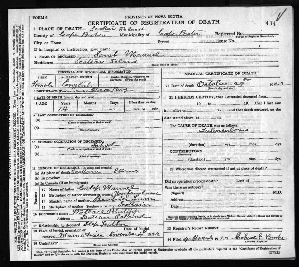 Death Registration: Year: 1922 file: 76 number: 434