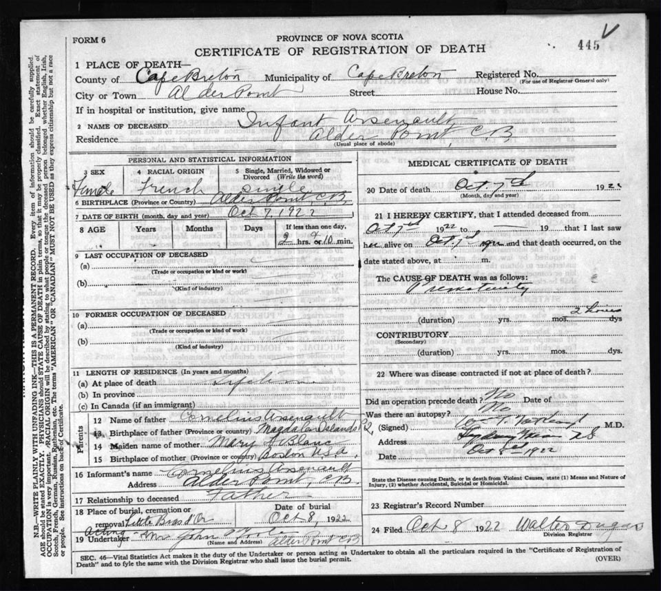 Female Death Registration: Year: 1922 file: 76 number: 445