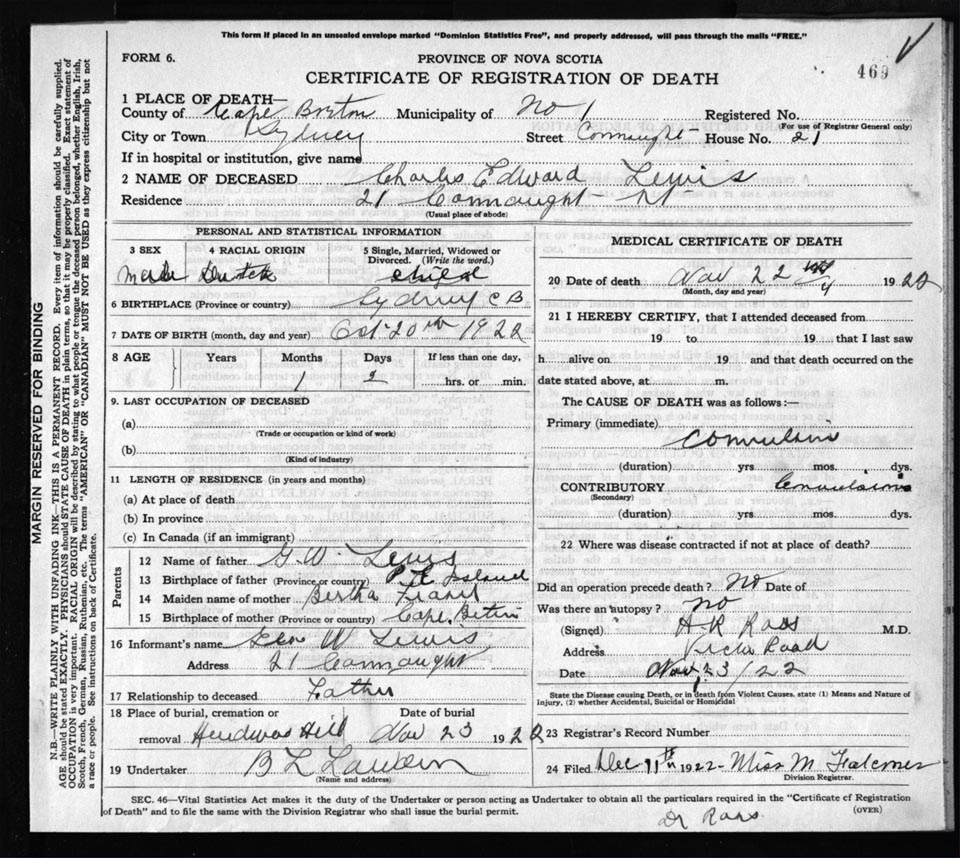 Death Registration: Year: 1922 file: 76 number: 469