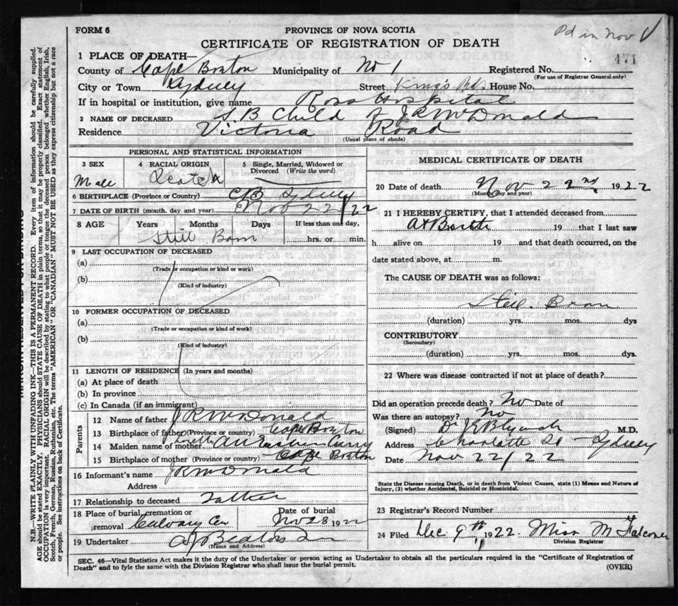 Male Death Registration: Year: 1922 file: 76 number: 471