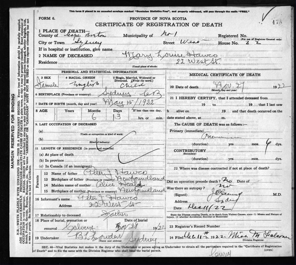 Death Registration: Year: 1922 file: 76 number: 478