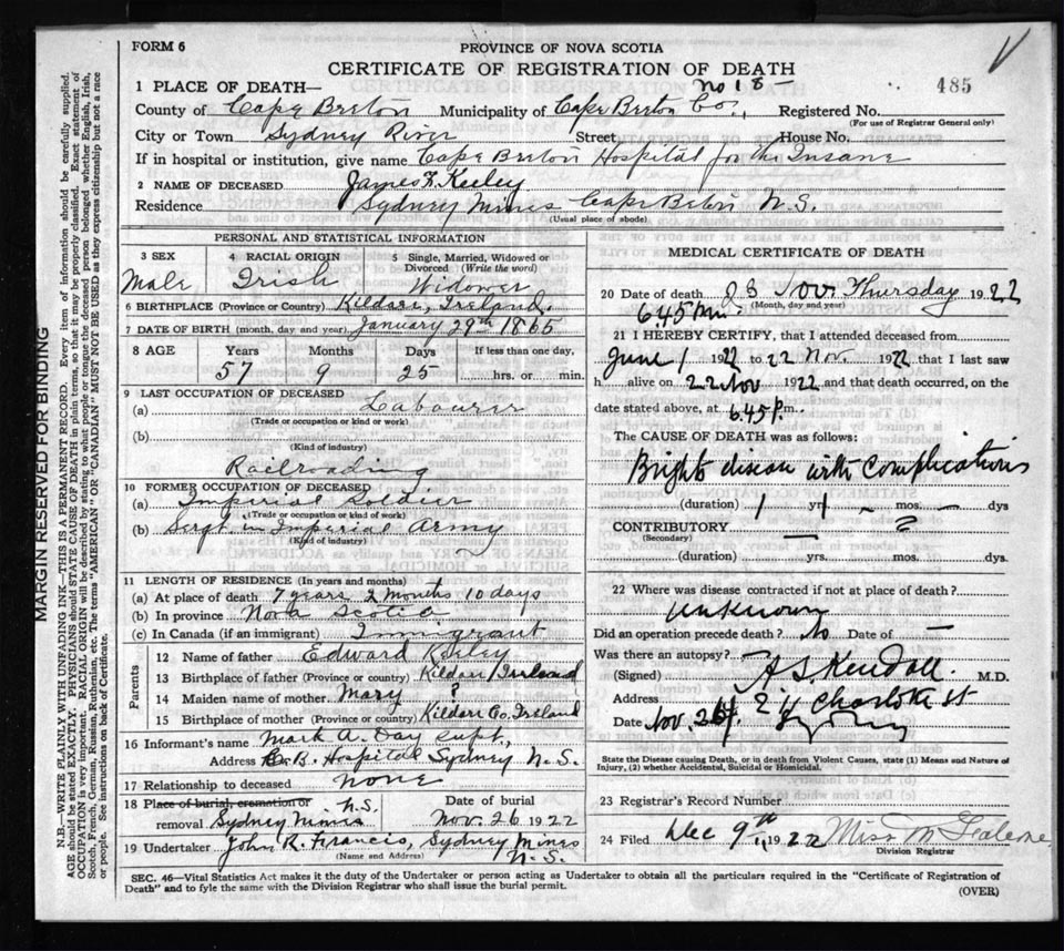 Death Registration: Year: 1922 file: 76 number: 485