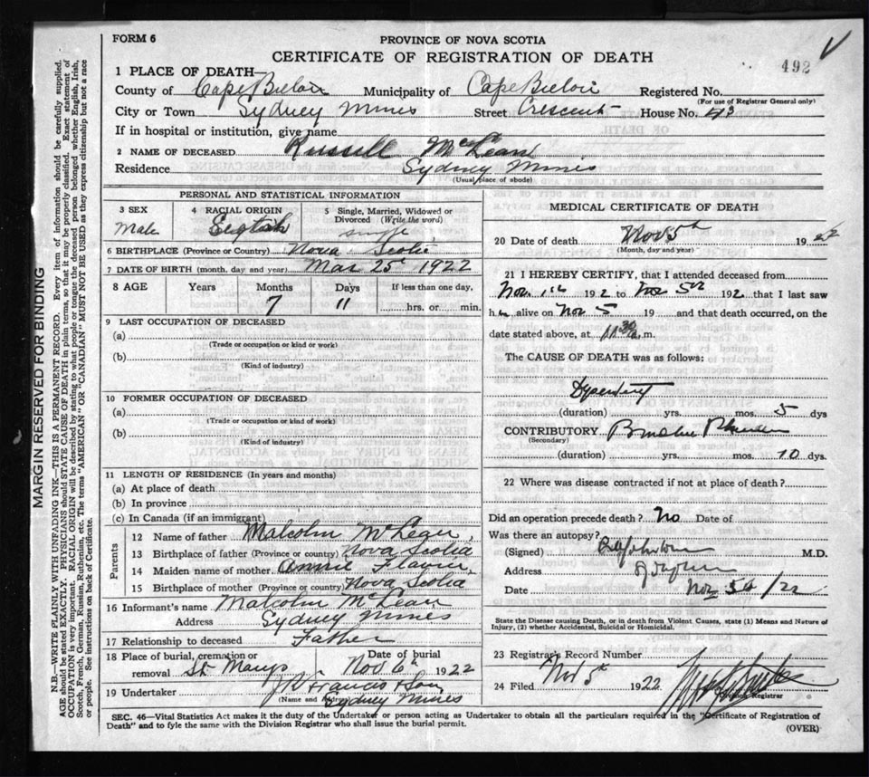 Death Registration: Year: 1922 file: 76 number: 492
