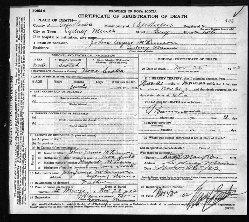 Death Registration: Year: 1922 file: 76 number: 496