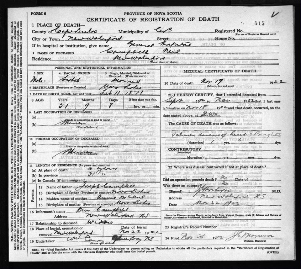 Death Registration: Year: 1922 file: 76 number: 515